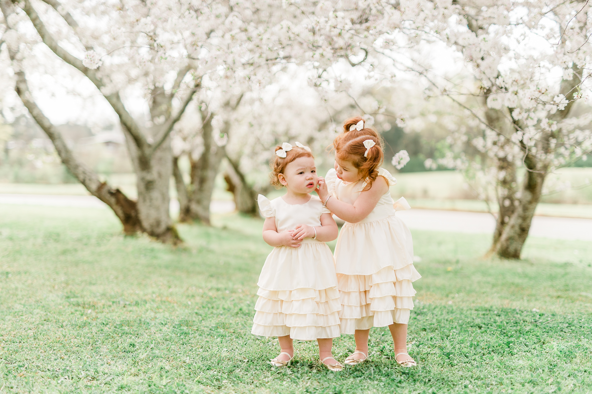 Jeana reached out wanting to have her daughters photographed, and it timed perfectly to do their photo shoot in the cherry blossoms! We took these at Wesleyan College, which is one of my favorite spots when the cherry blossoms are blooming. It was the perfect location for this sweet photo shoot. Rebecca and Rachel are adorable, and I couldn’t handle their cuteness! Seriously, can you believe their beautiful red, curly hair?! Rebecca was so sweet checking on her little sister through the shoot, and I can tell they’re going to be the of best friends!
